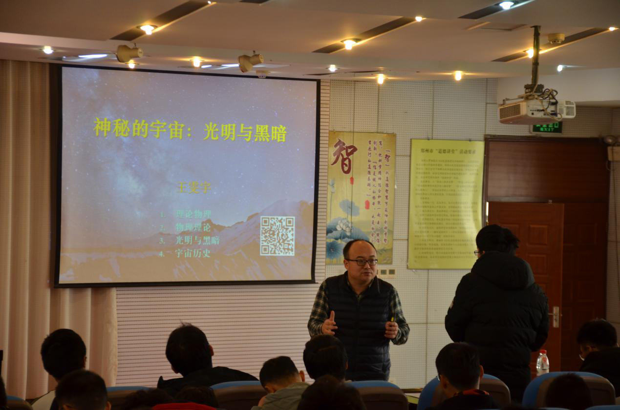 王雯宇教授以“神秘的宇宙:光明与黑暗”为主题,用引人入胜的语言阐释了“什么是物理学”,并图文并茂的为大家讲解了大爆炸、引力、时空弯曲、暗物质等主要内容,逐步为大家揭开了神秘的科学面纱。随后,他带领大家了解了国内暗物质实验进展现状,并留下了“宇宙是有限的还是无限的?大爆炸以前宇宙是什么?宇宙的最终命运是什么?”三个问题供大家思考讨论。讲座最后,同学们积极地进行提问,王雯宇教授用通俗而不失严谨,并带有启迪性的方式回答了学生的问题。