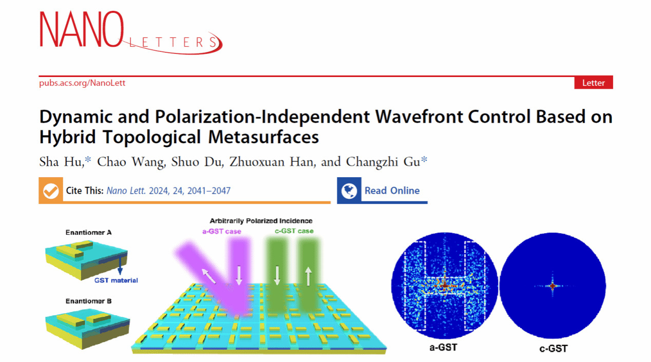 青年教师胡莎博士在纳米科技领域国际顶级期刊《Nano Letters》(中科院一区TOP,IF = 10.8)上发表了题为“Dynamic and Polarization-Independent Wavefront Control Based on Hybrid Topological Metasurfaces”(DOI: 10.1021/acs.nanolett.3c04621)的研究型论文。胡莎博士为论文的第一作者和第一通讯作者,中科院物理所顾长志研究员为共同通讯作者,河南工业大学为第一署名单位和第一通讯单位。