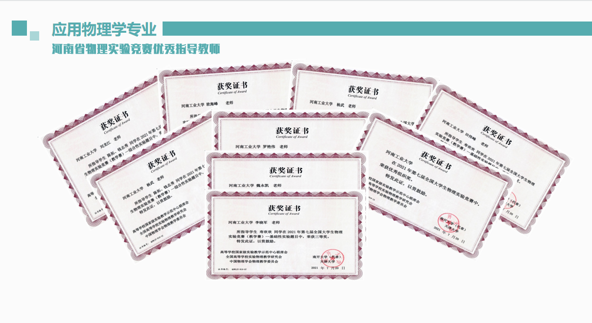 积极开展教学改革并取得显著成绩。自2019年以来,完成高教课题30多项,获得河南省高等教育教学成果一等奖、二等奖校级教学成果特等奖,一等奖20余项,获河南省、教育厅教学奖励50多人次。其中,获河南省教育系统教学技能竞赛一等奖10余人,河南省本科高校青年教师课堂教学创新大赛一等奖2人,二等奖1人,全国高校数学微课程教学设计竞赛国家二等奖1人,河南赛区特等、一等、二等奖6人,河南省本科高校青年教师数学教学技能竞赛一等奖3人,二等奖1人,三等奖2人,校长教学质量奖36人次。下注足球
