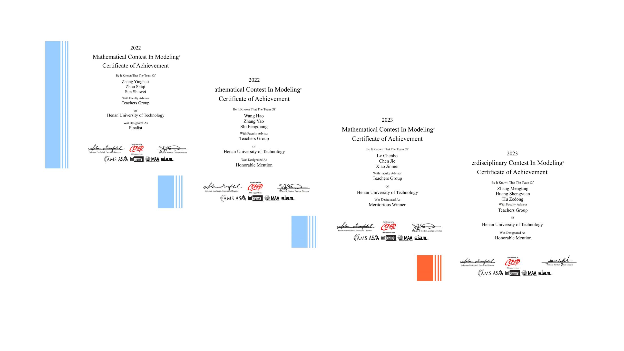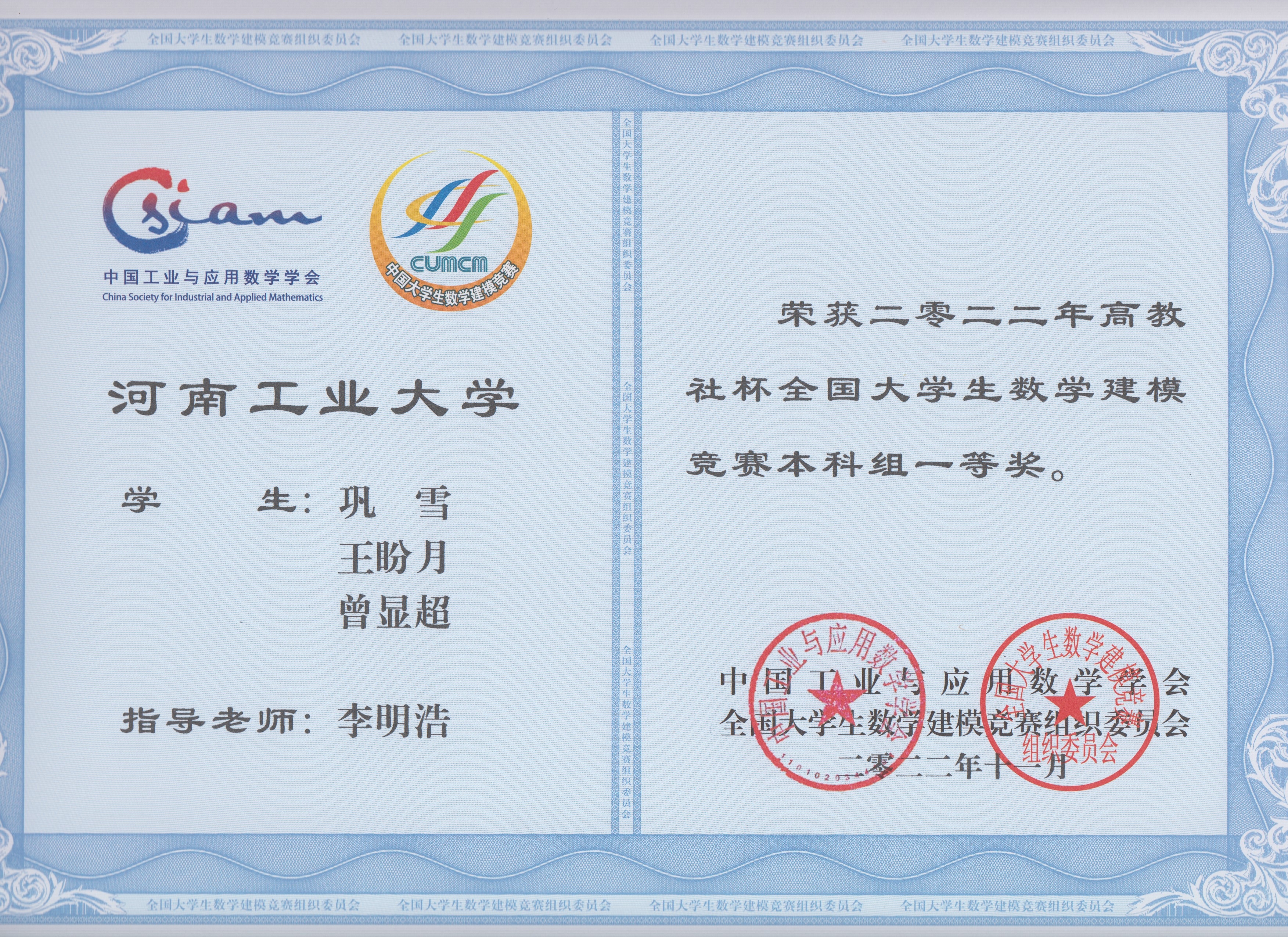 注重学生素质能力培养,自2019年至2022年,积极组织学生参加各级数学建模竞赛,共获得国际奖44项、国家奖2项、省级奖115项;数学学科竞赛共获得国家级奖项1个、省级奖项138个;物理实验竞赛共获得国家级奖项13个、省级奖项11个;市场调查与分析大赛获得国家级奖1项,省部级4项;统计建模竞赛获得省级奖5项;全国大学生数据统计与分析竞赛获得省级奖1项;数学建模网络挑战赛获得省级奖22项;“挑战杯”课外科技作品竞赛河南省省级一等奖2项、三等奖1项;“互联网+”全国大学生创新创业大赛获省级三等奖1项;下注足球